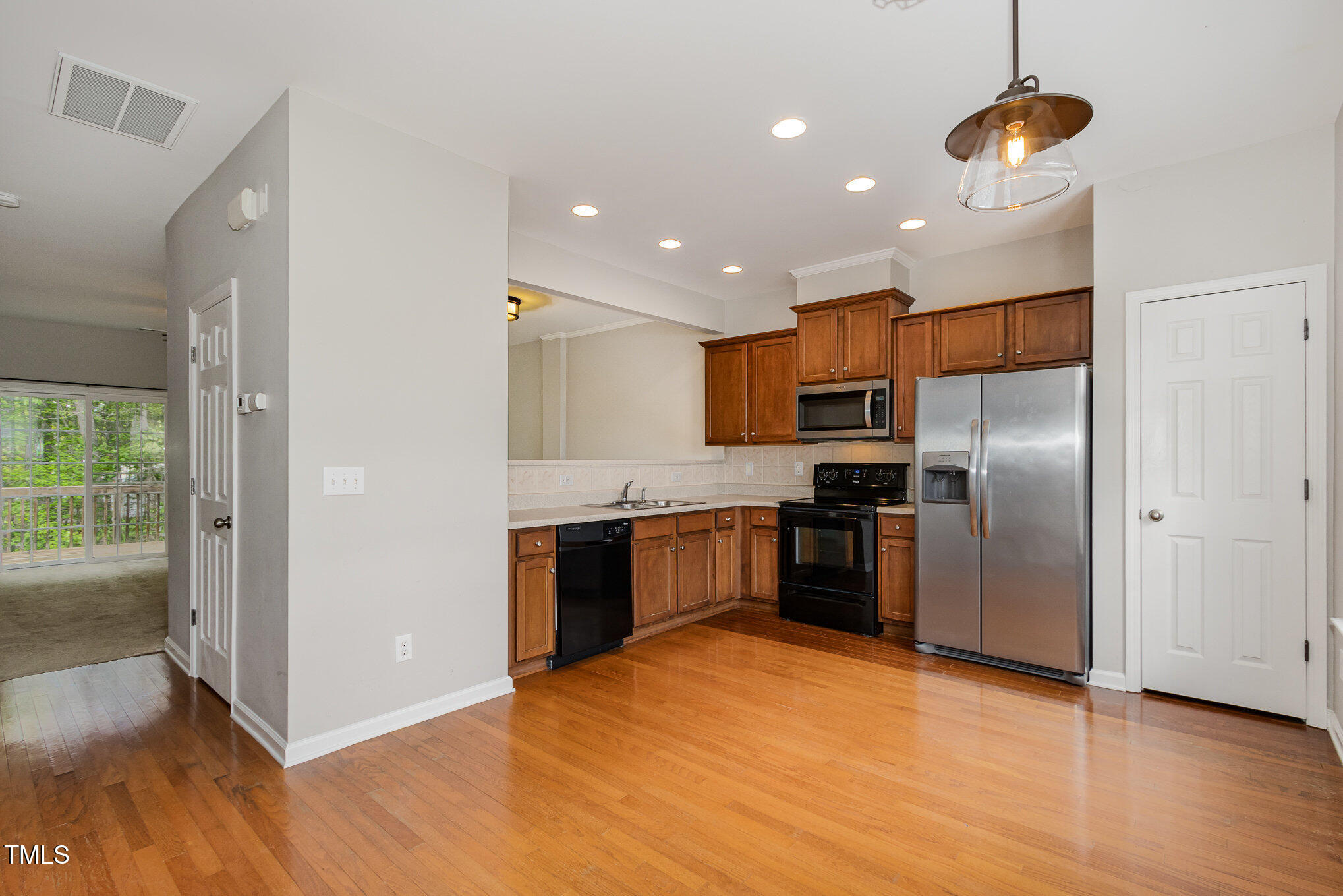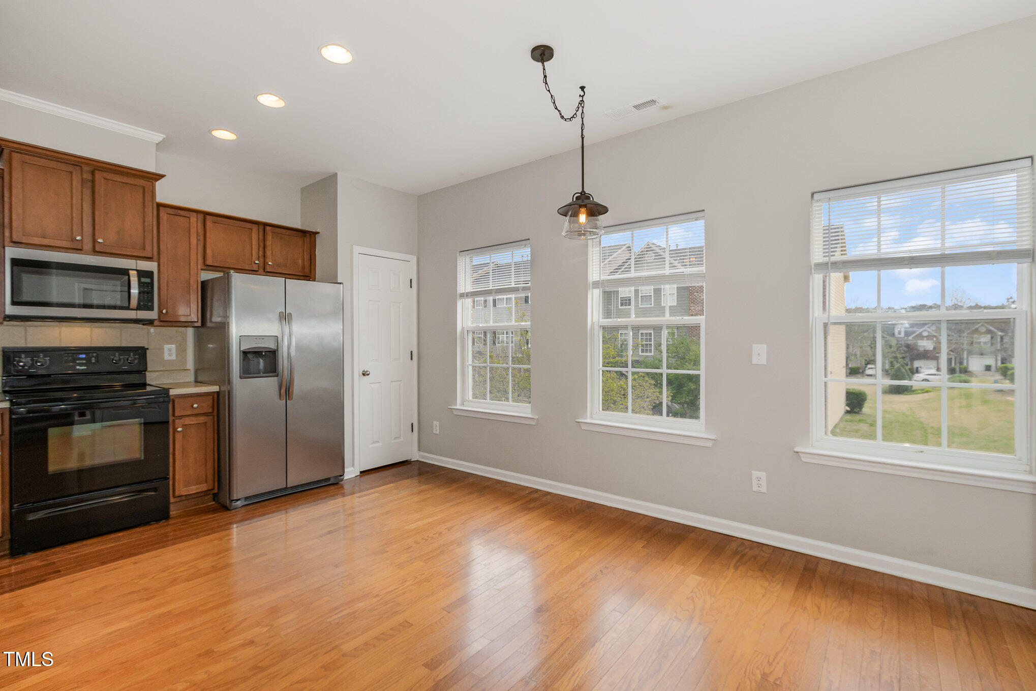 This beautiful 3 bedroom - 3-story brick front end-unit townhouse is located in the desirable Miramonte community, just minutes from shopping, dining, I-540, NC-55, and US-1. The first floor features a bedroom with full bath, perfect for a guest suite or convert to an office space! Upstairs you will find an open floorplan with a fully equipped eat-in kitchen with stainless steel appliances. In addition to the spacious and bright kitchen, you'll find a separate dining area and laundry. With a private wooded deck and lower walk-out patio, there is plenty of room to relax outdoors, or set up your own garden oasis. The primary suite features dual sinks in the en-suite bath and spacious walk-in closet. Enjoy convenient parking with a one-car garage and driveway space. Community amenities include yard maintenance, pool, clubhouse, play area, walking trails, and tennis courts. When you're ready to leave the comfort of home, travel only 4 miles to downtown Apex and less than that to bordering shopping and restaurants in Holly Springs!