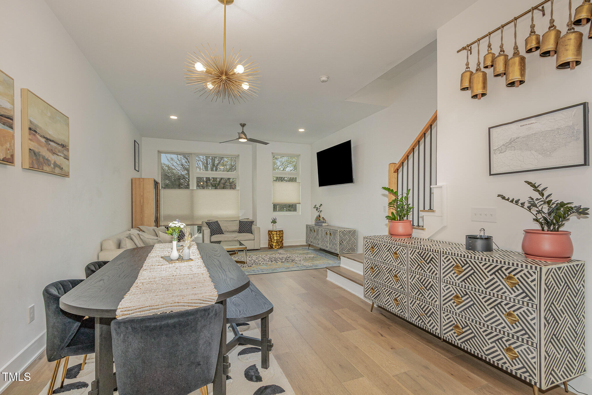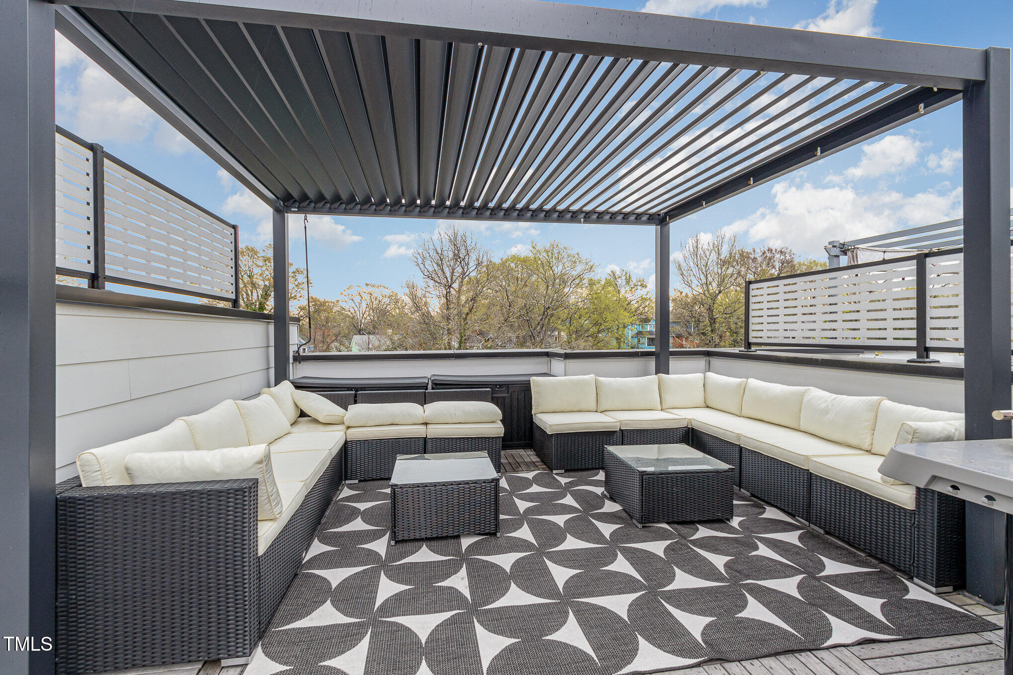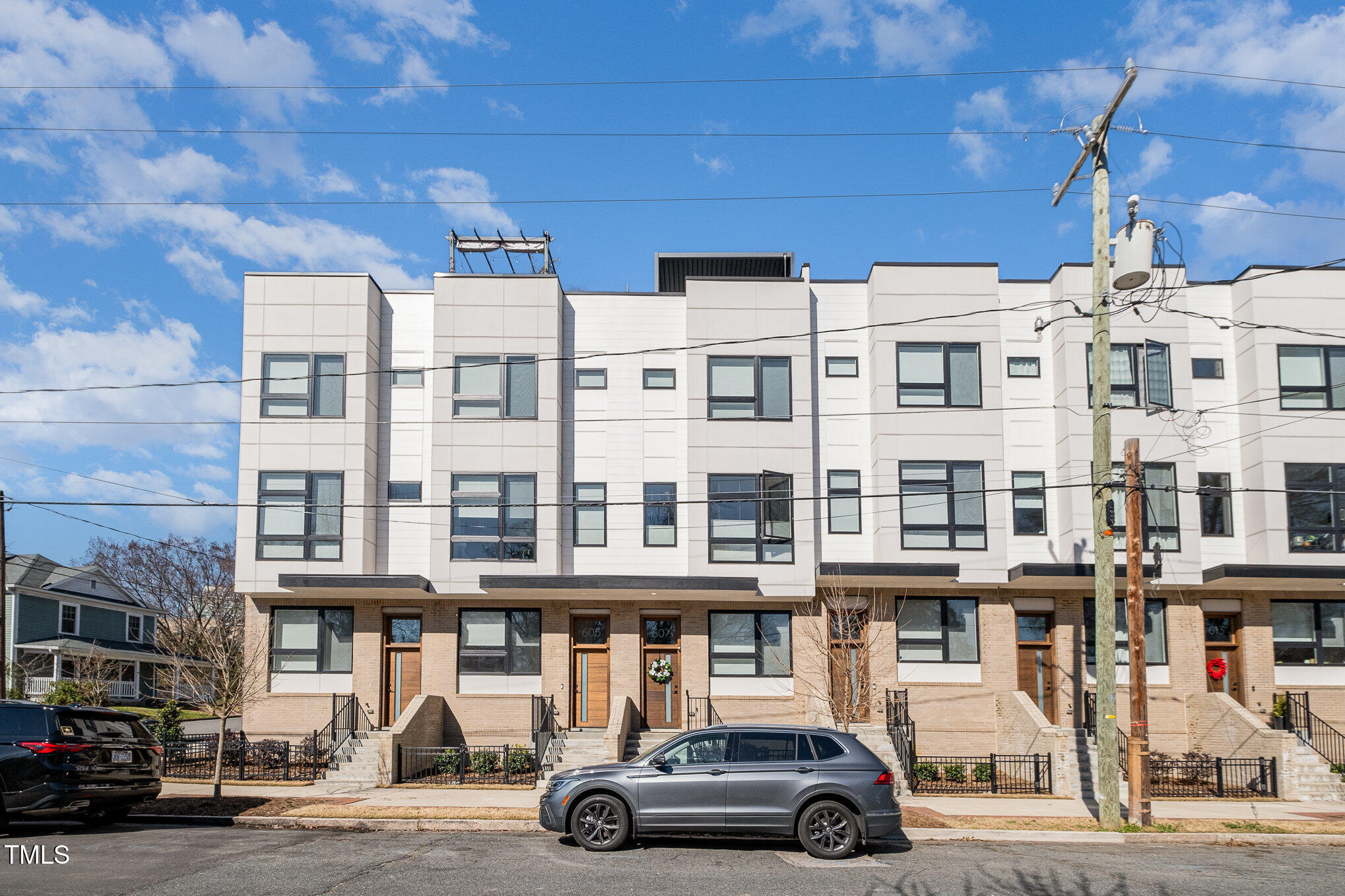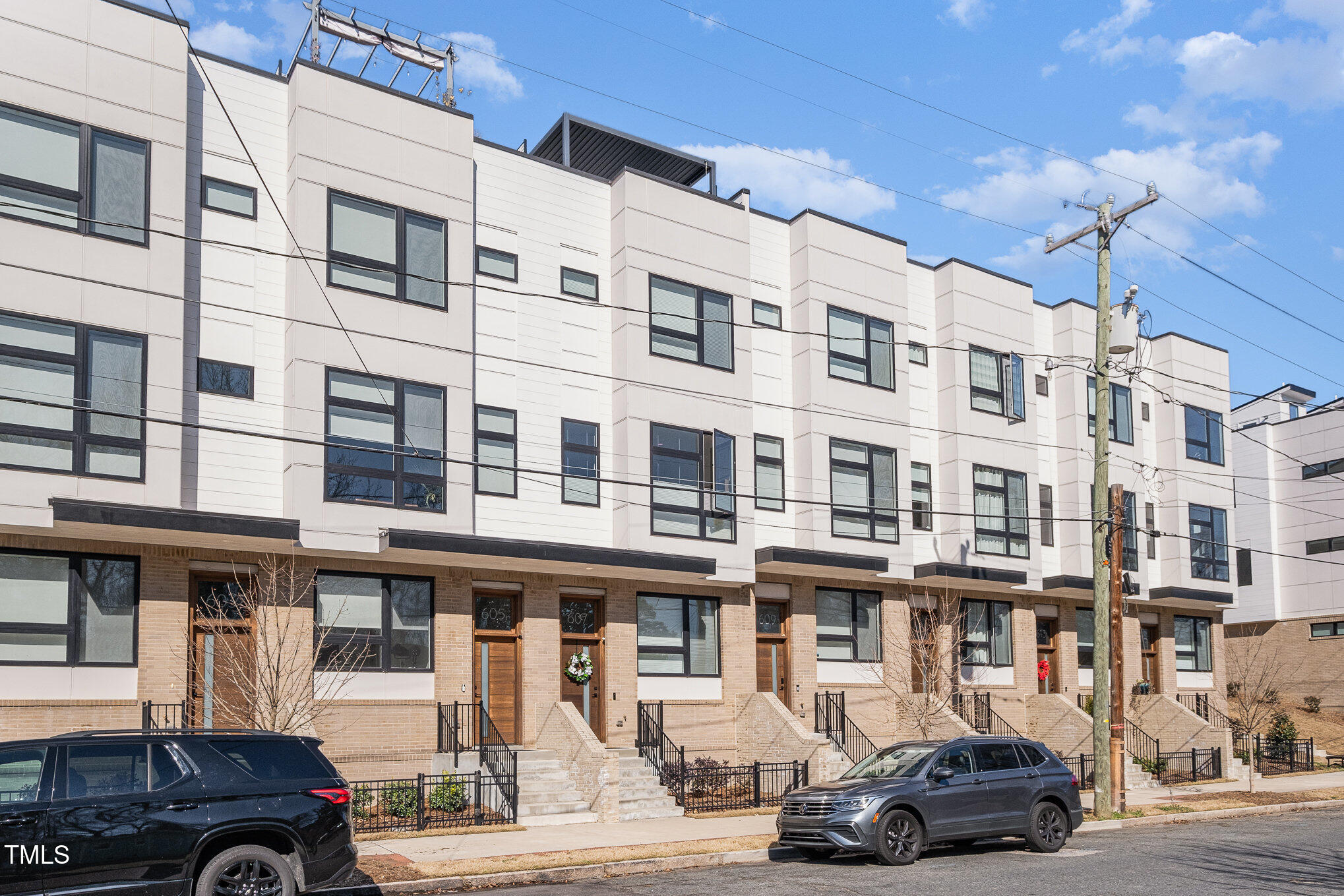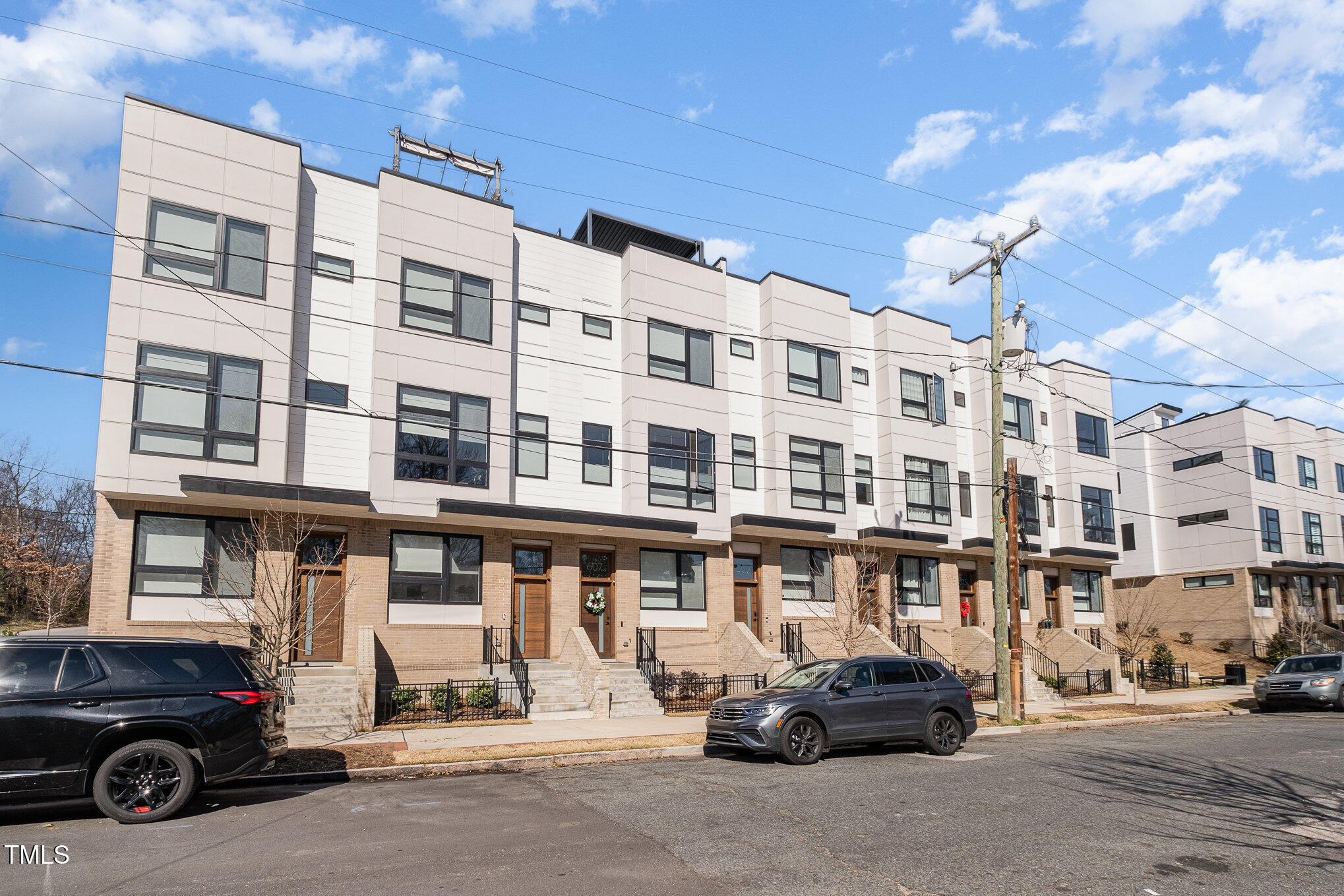 With the downtown Durham skyline in view, this modern townhome features an open floor plan with high ceilings, eastern exposure, and hardwood floors throughout. Casement and floor-to-ceiling dual-functioning windows with custom treatments bring in abundant natural light. The gourmet kitchen boasts quartz countertops, a waterfall island, and upgraded stainless appliances, flowing into a spacious living area perfect for entertaining. A porch off the kitchen offers a cozy spot for morning coffee. The primary suite includes dual vanities, a walk-in shower, and a generous closet, while additional bedrooms provide flexible space for guests, an office, or a gym. A private roof deck with a pergola w/ retractable shade extends across the top level, ideal for relaxing or hosting. Make your gathering or relaxing evening even better with built-in features that allow for gas firepits or grills. A garage with EV charging hookup and off-street parking make downtown living even more convenient. Welcome to your urban oasis, this is one not to miss!
