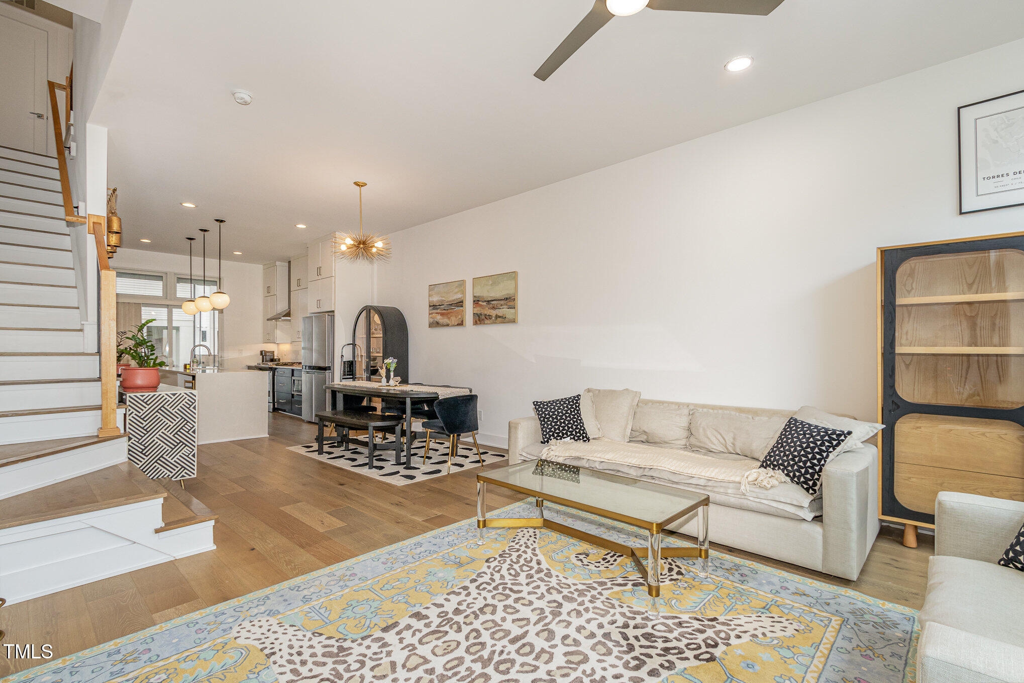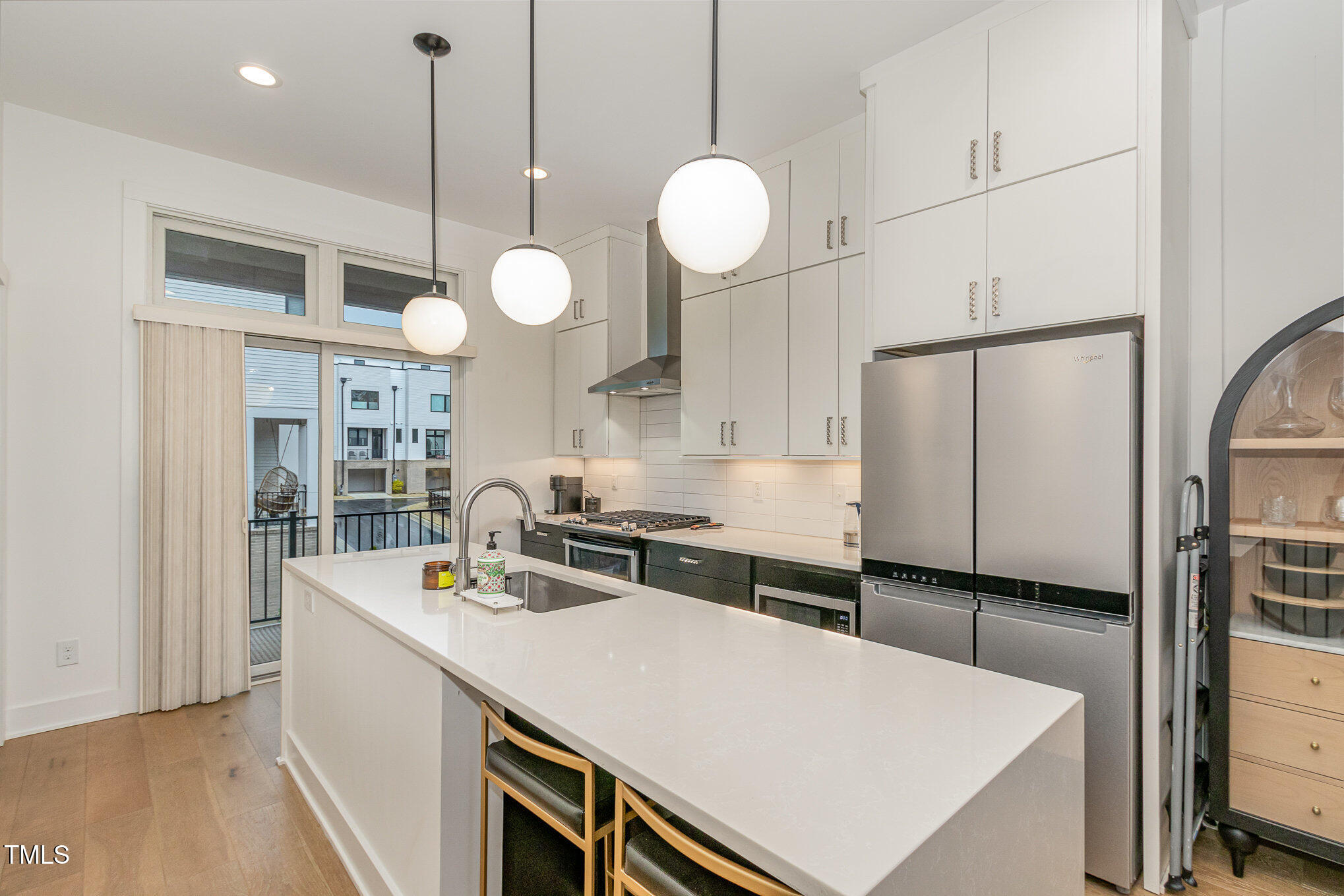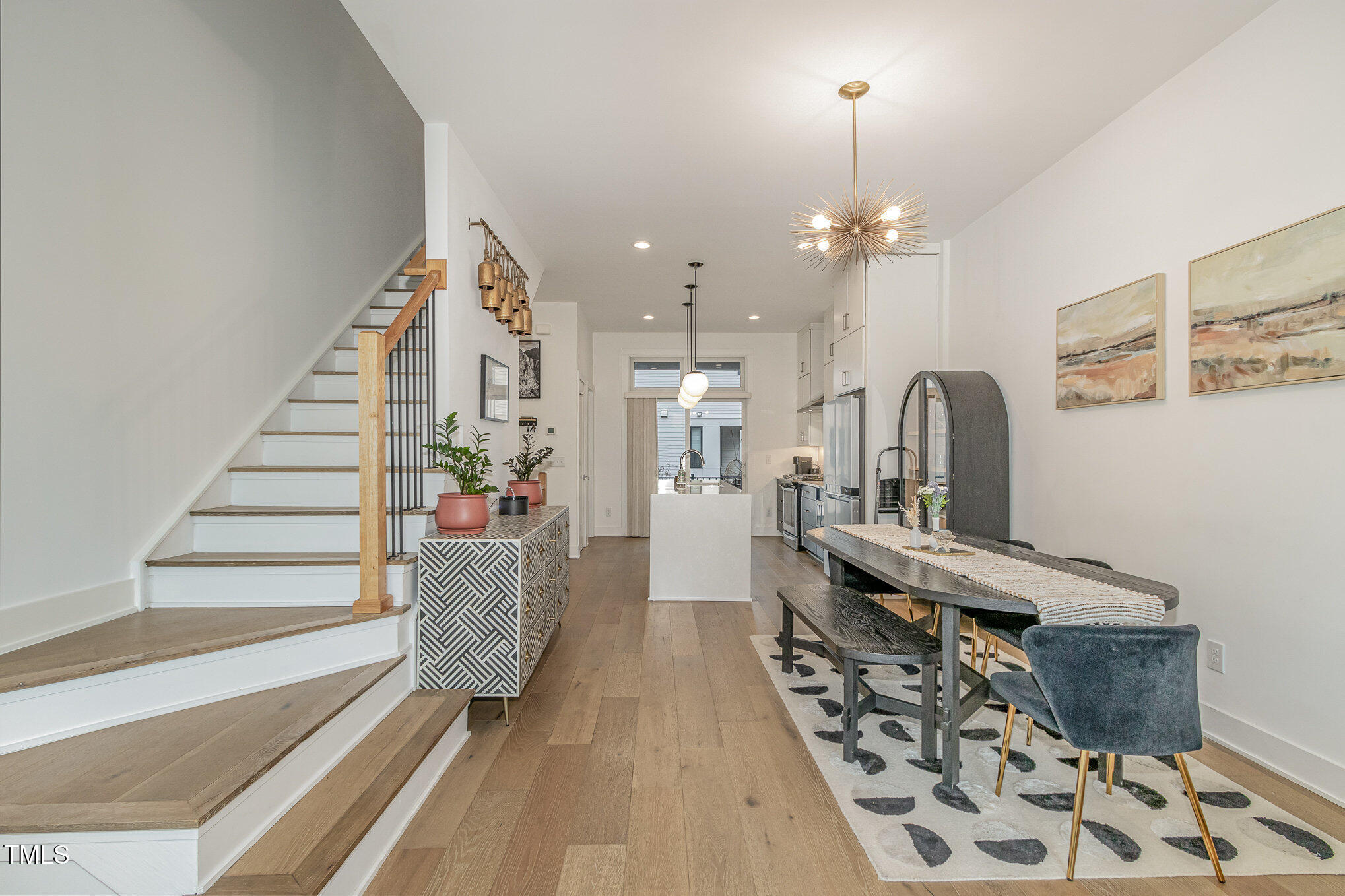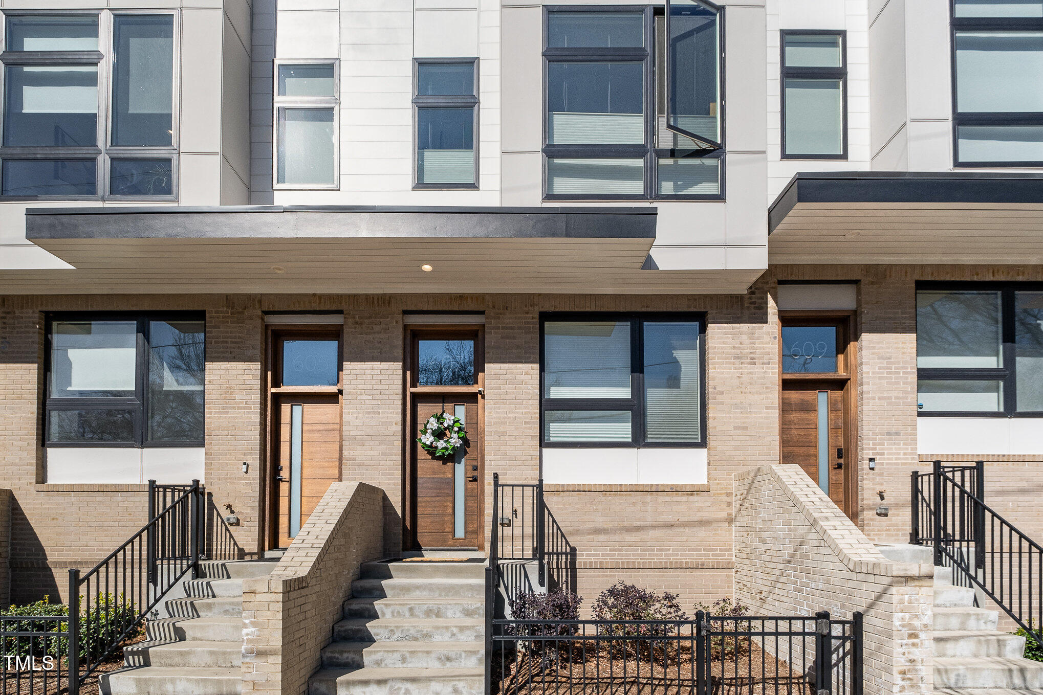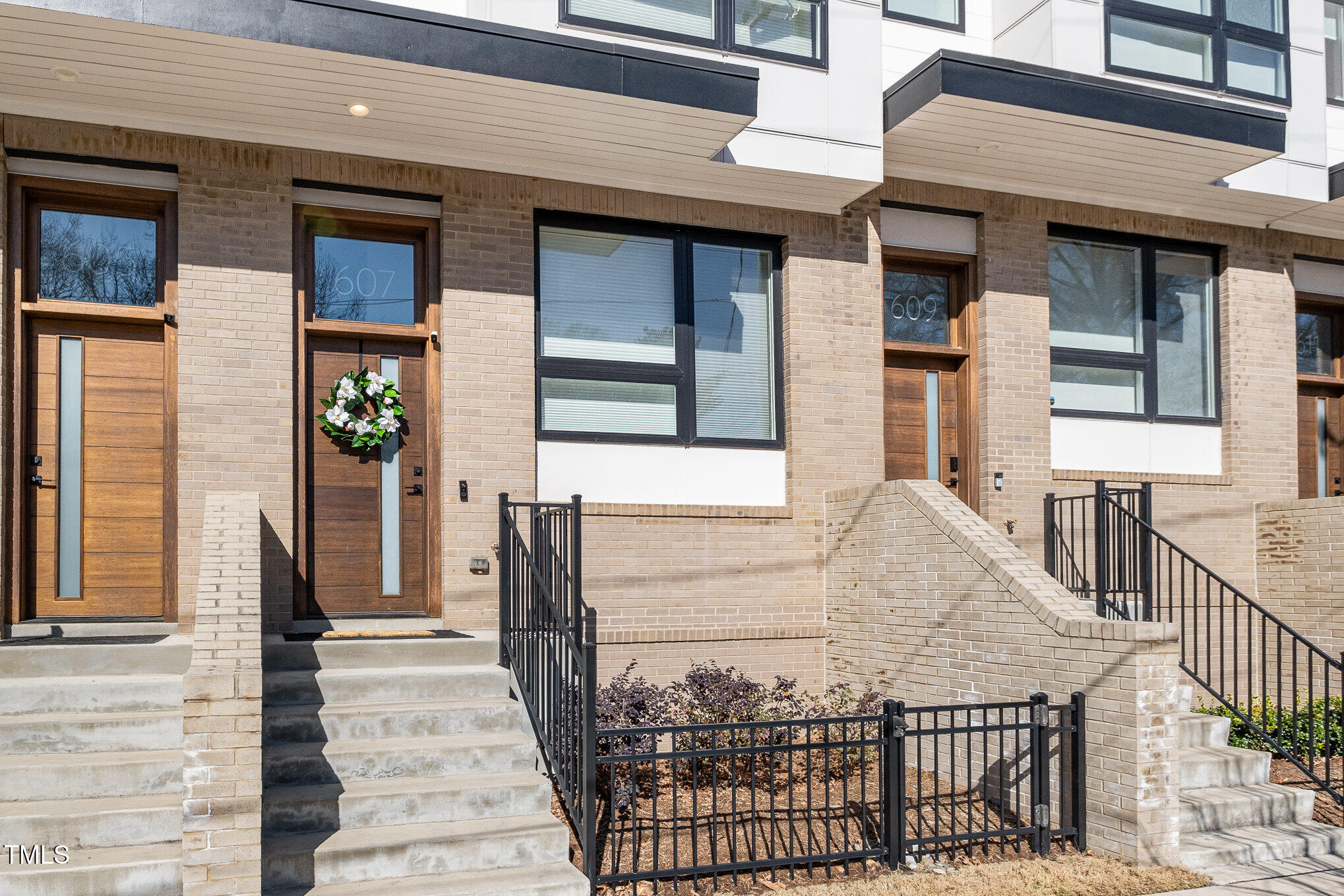 With the downtown Durham skyline in view, this modern townhome features an open floor plan with high ceilings, eastern exposure, and hardwood floors throughout. Casement and floor-to-ceiling dual-functioning windows with custom treatments bring in abundant natural light. The gourmet kitchen boasts quartz countertops, a waterfall island, and upgraded stainless appliances, flowing into a spacious living area perfect for entertaining. A porch off the kitchen offers a cozy spot for morning coffee. The primary suite includes dual vanities, a walk-in shower, and a generous closet, while additional bedrooms provide flexible space for guests, an office, or a gym. A private roof deck with a pergola w/ retractable shade extends across the top level, ideal for relaxing or hosting. Make your gathering or relaxing evening even better with built-in features that allow for gas firepits or grills. A garage with EV charging hookup and off-street parking make downtown living even more convenient. Welcome to your urban oasis, this is one not to miss!