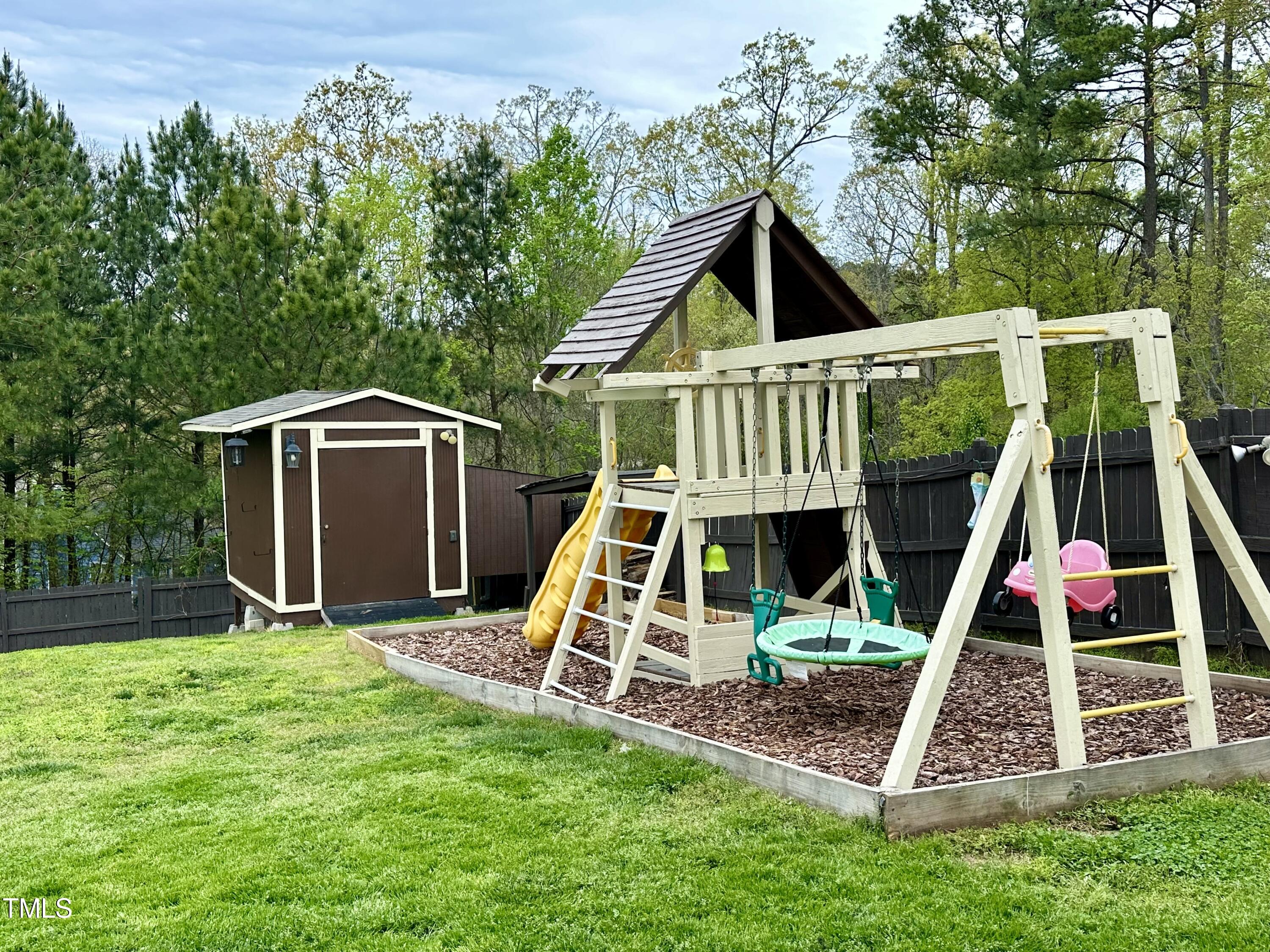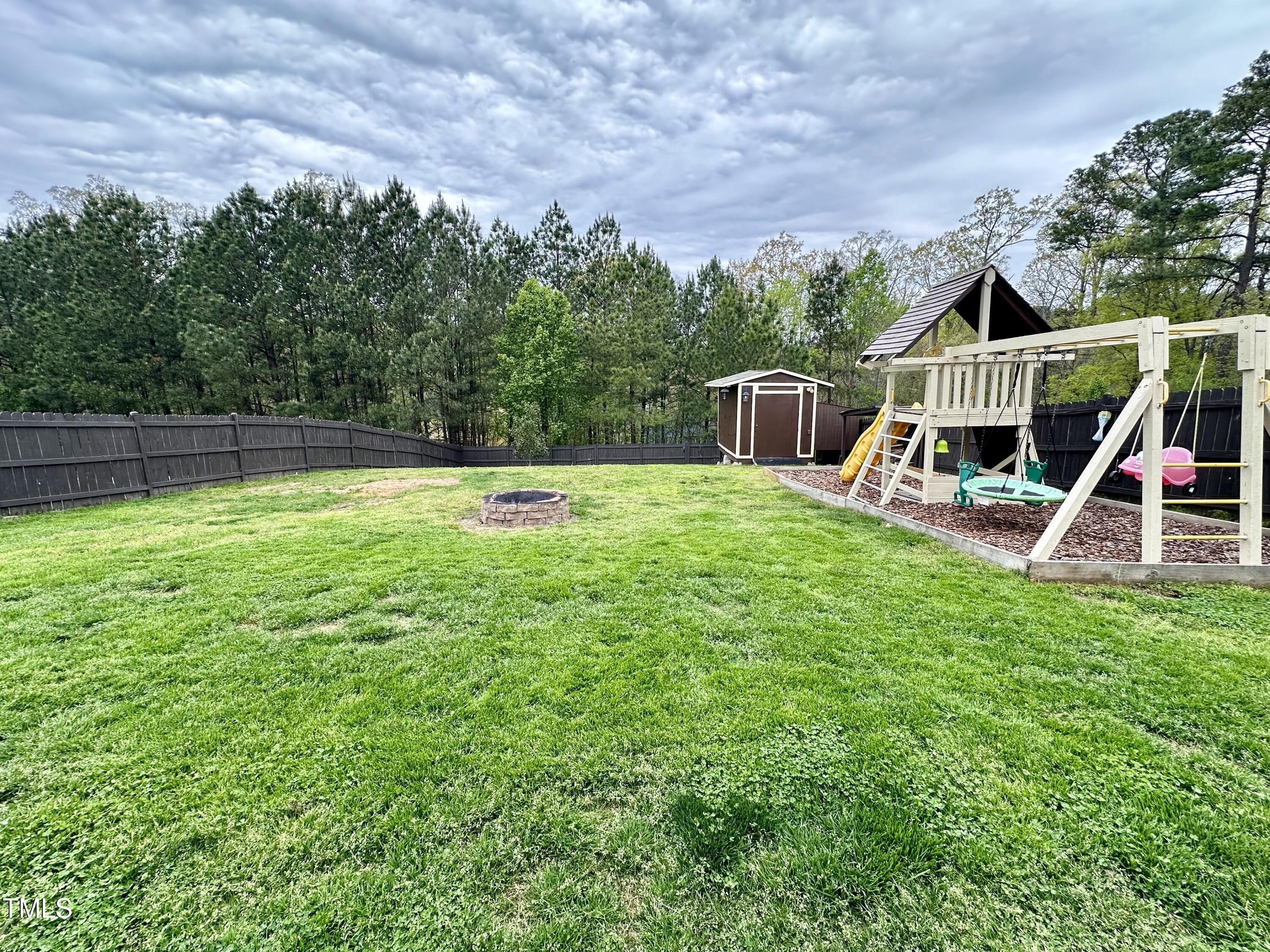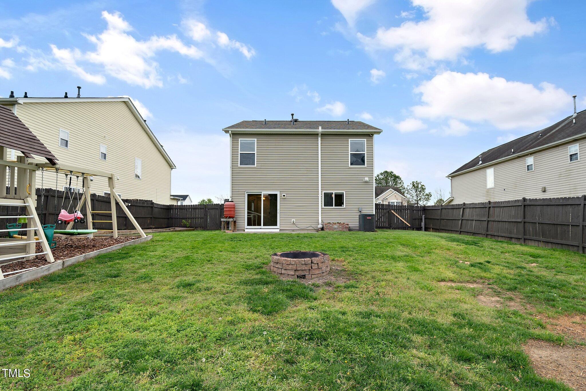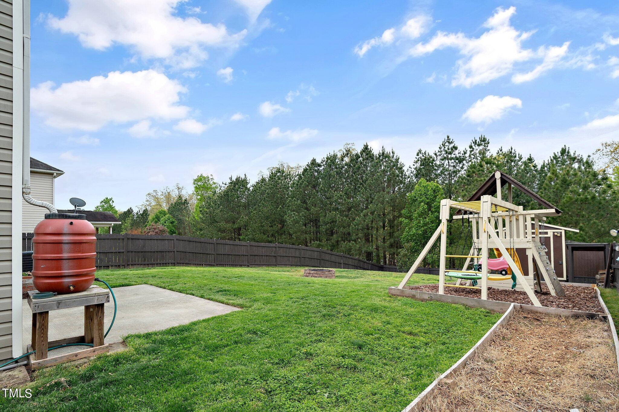 Gorgeous home on a quarter acre privacy fenced lot overlooking a wooded HOA buffer. All the work has been done for you, including a new roof (2024), newer HVAC (2020) , new carpet, new light fixtures and fresh paint. Large kitchen features new granite counters, white cabinets, stainless steel appliances and recessed lighting. There is a second pantry closet that leads to additional storage under the stairs. Open floor plan highlighted by a gas fireplace in the living room. Lots of natural light throughout. Exit to patio through a newer Pella sliding glass door. Upstairs, you'll find a large primary bedroom with a tray ceiling, large walk-in, and a large soaking tub & shower. Nicely sized secondary bedrooms with ceiling fans. Large laundry room and washer & dryer convey. The carpet upstairs was just replaced. Oversized two car garage features a 240v outlet suitable for a car charger, two ceiling fans, recessed lighting, built-in shelving and a surge protector. The great backyard features a six foot high privacy fence, a large wired shed, a large play set, a fire pit and a garden area. This home has it all. Great location convenient to downtown Durham and RTP.