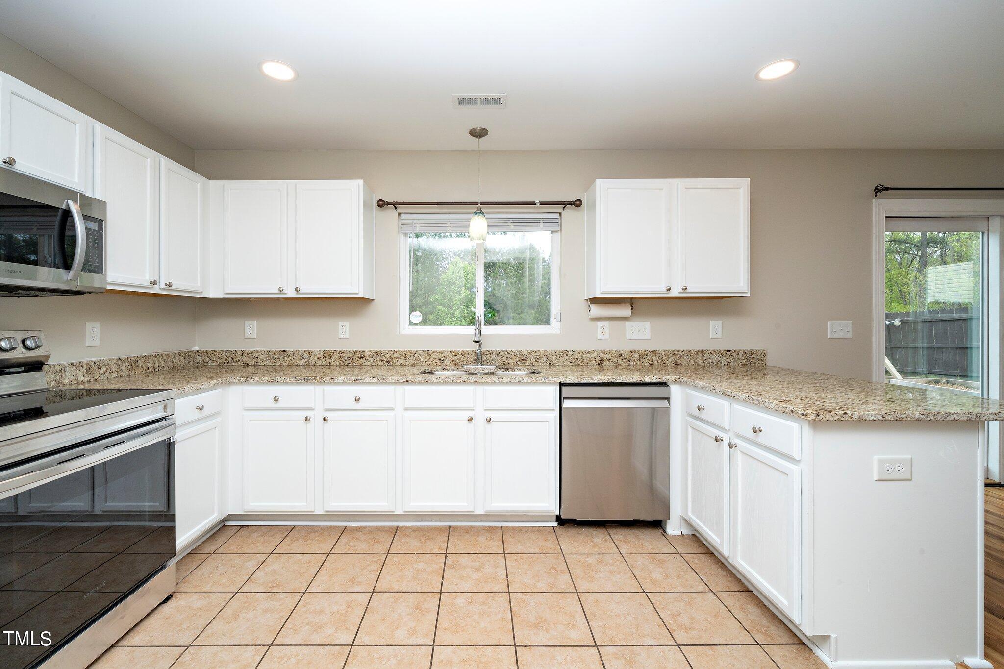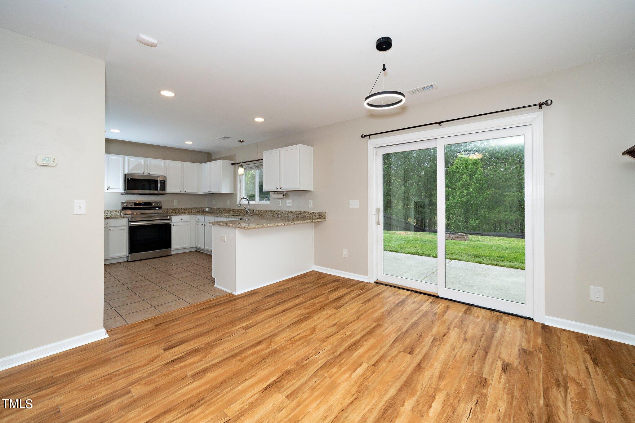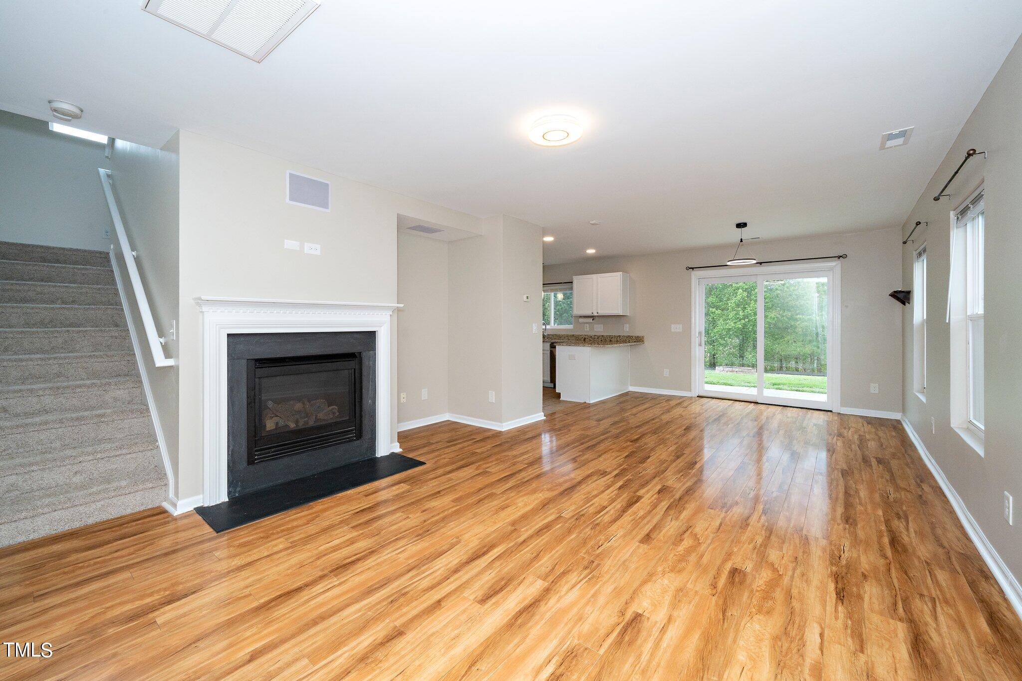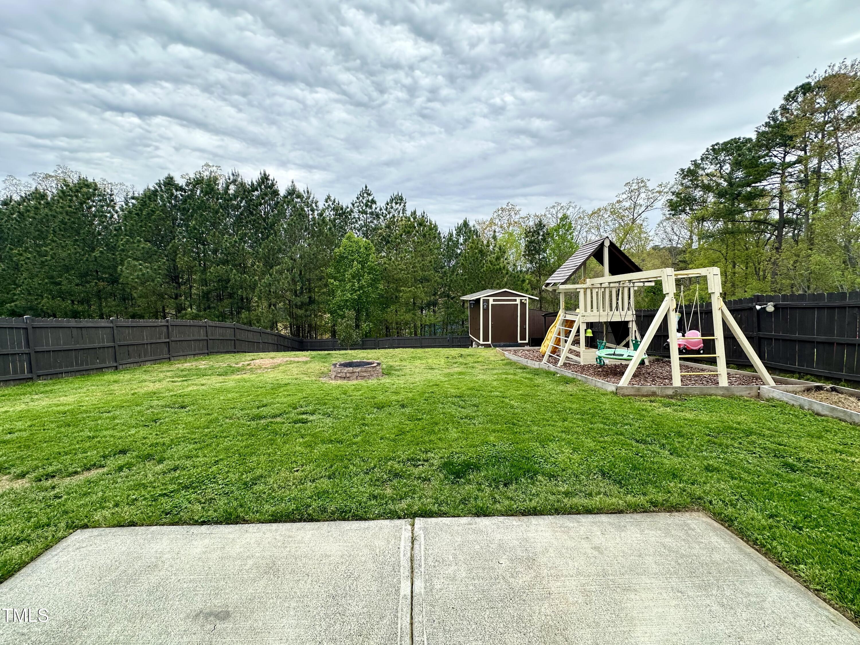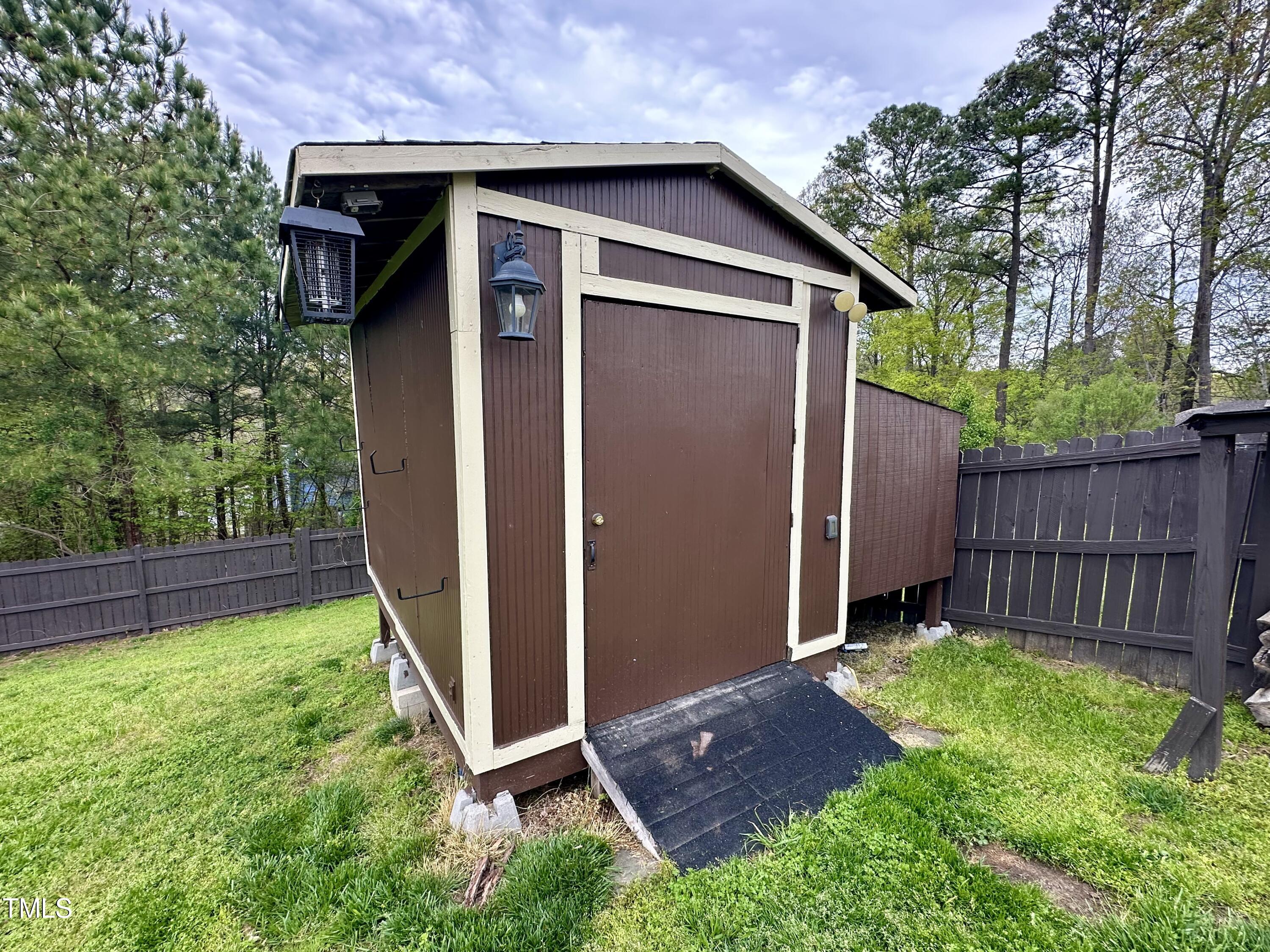 Gorgeous home on a quarter acre privacy fenced lot overlooking a wooded HOA buffer. All the work has been done for you, including a new roof (2024), newer HVAC (2020) , new carpet, new light fixtures and fresh paint. Large kitchen features new granite counters, white cabinets, stainless steel appliances and recessed lighting. There is a second pantry closet that leads to additional storage under the stairs. Open floor plan highlighted by a gas fireplace in the living room. Lots of natural light throughout. Exit to patio through a newer Pella sliding glass door. Upstairs, you'll find a large primary bedroom with a tray ceiling, large walk-in, and a large soaking tub & shower. Nicely sized secondary bedrooms with ceiling fans. Large laundry room and washer & dryer convey. The carpet upstairs was just replaced. Oversized two car garage features a 240v outlet suitable for a car charger, two ceiling fans, recessed lighting, built-in shelving and a surge protector. The great backyard features a six foot high privacy fence, a large wired shed, a large play set, a fire pit and a garden area. This home has it all. Great location convenient to downtown Durham and RTP.