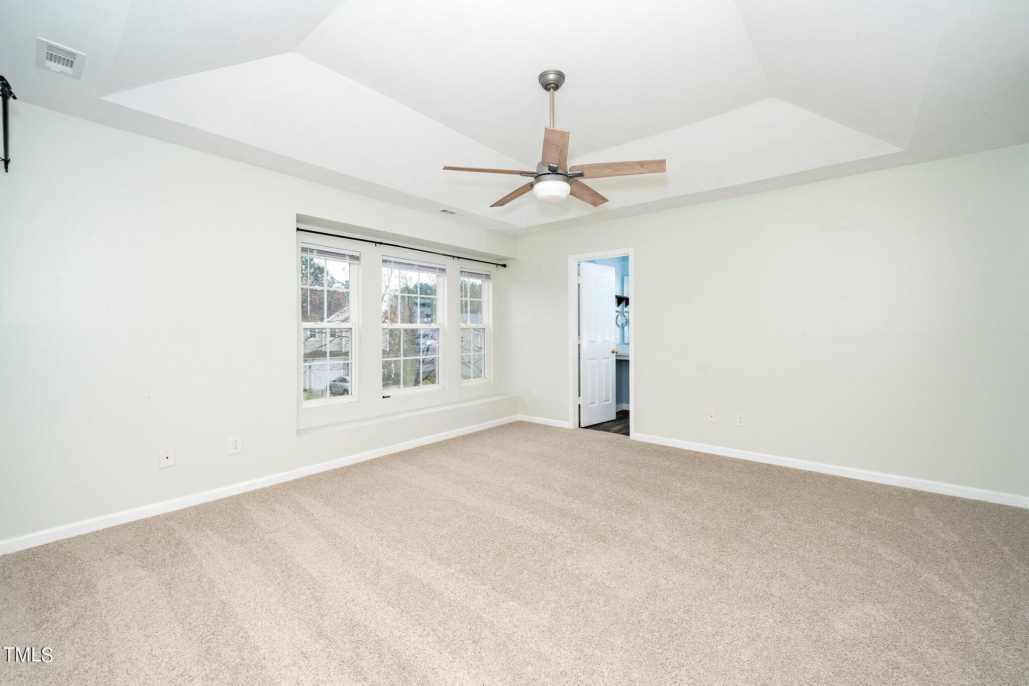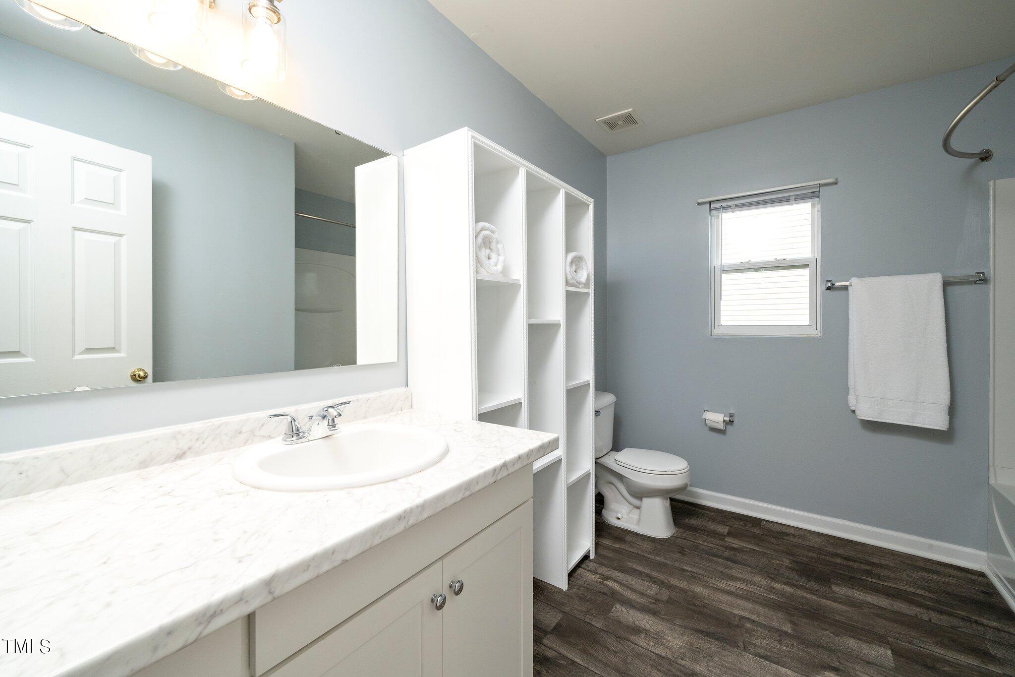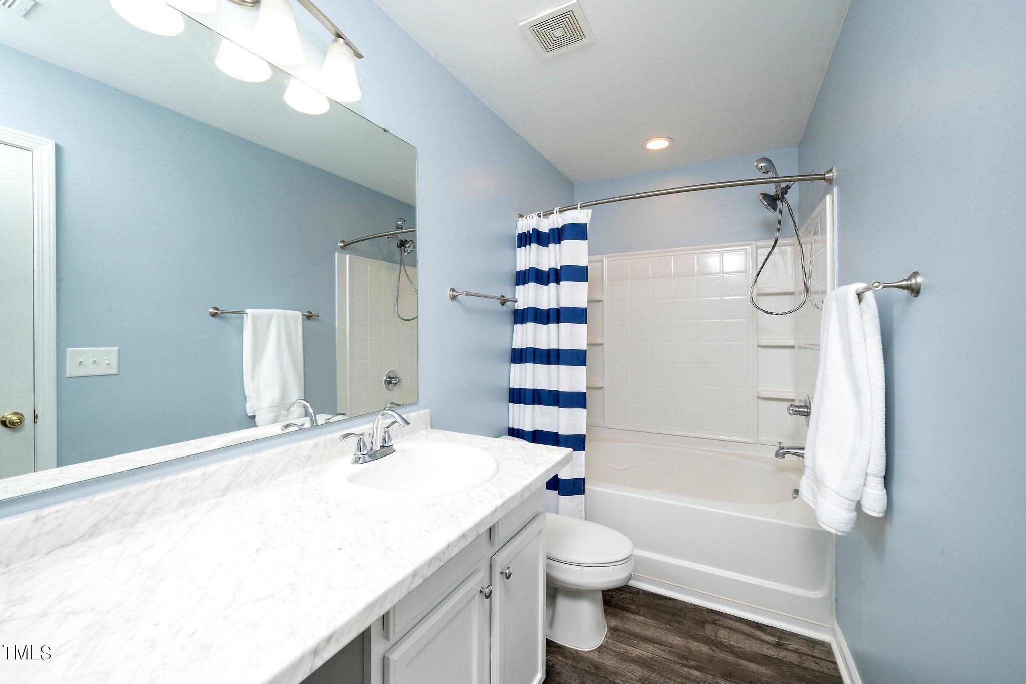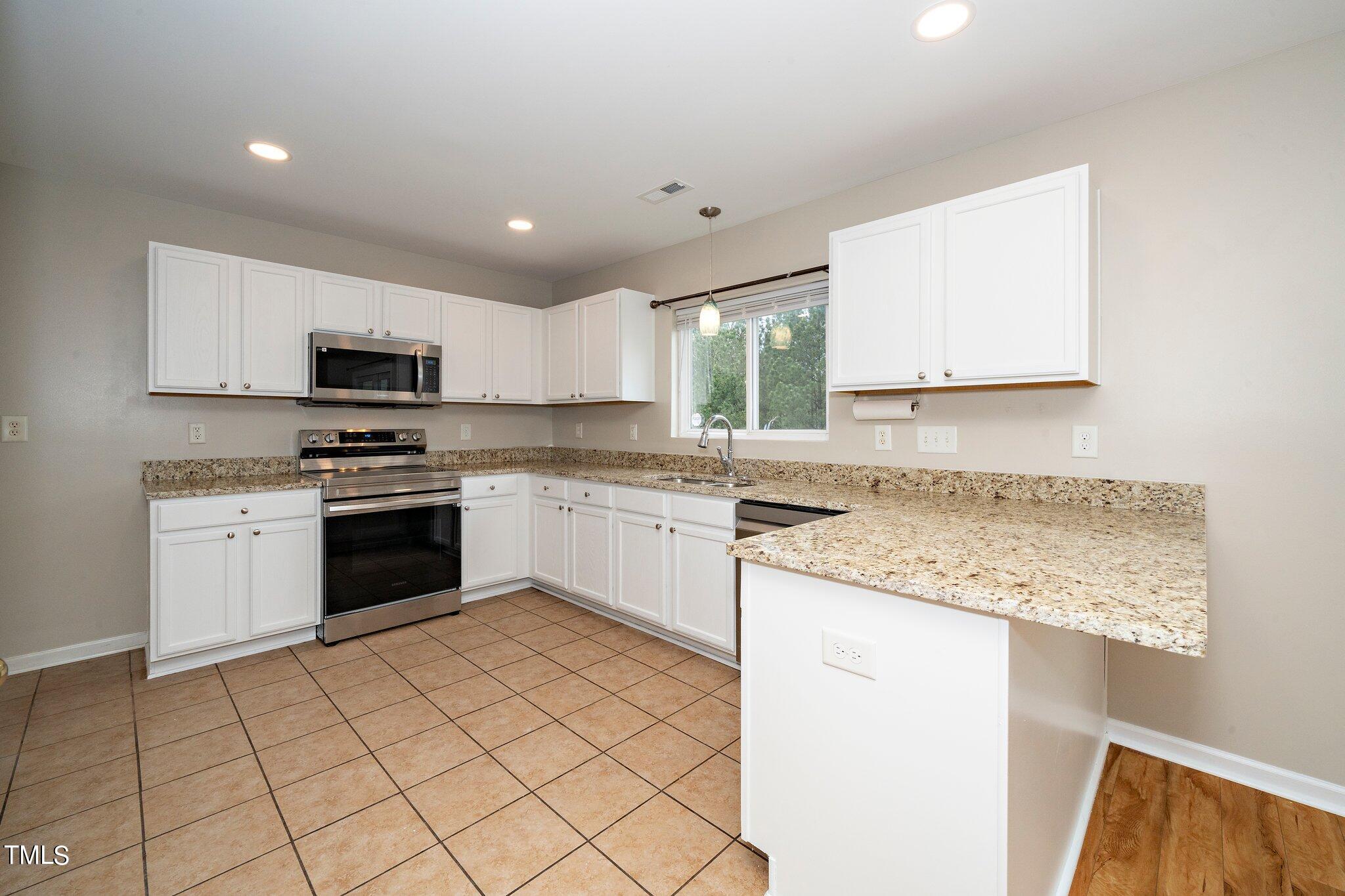 Gorgeous home on a quarter acre privacy fenced lot overlooking a wooded HOA buffer. All the work has been done for you, including a new roof (2024), newer HVAC (2020) , new carpet, new light fixtures and fresh paint. Large kitchen features new granite counters, white cabinets, stainless steel appliances and recessed lighting. There is a second pantry closet that leads to additional storage under the stairs. Open floor plan highlighted by a gas fireplace in the living room. Lots of natural light throughout. Exit to patio through a newer Pella sliding glass door. Upstairs, you'll find a large primary bedroom with a tray ceiling, large walk-in, and a large soaking tub & shower. Nicely sized secondary bedrooms with ceiling fans. Large laundry room and washer & dryer convey. The carpet upstairs was just replaced. Oversized two car garage features a 240v outlet suitable for a car charger, two ceiling fans, recessed lighting, built-in shelving and a surge protector. The great backyard features a six foot high privacy fence, a large wired shed, a large play set, a fire pit and a garden area. This home has it all. Great location convenient to downtown Durham and RTP.