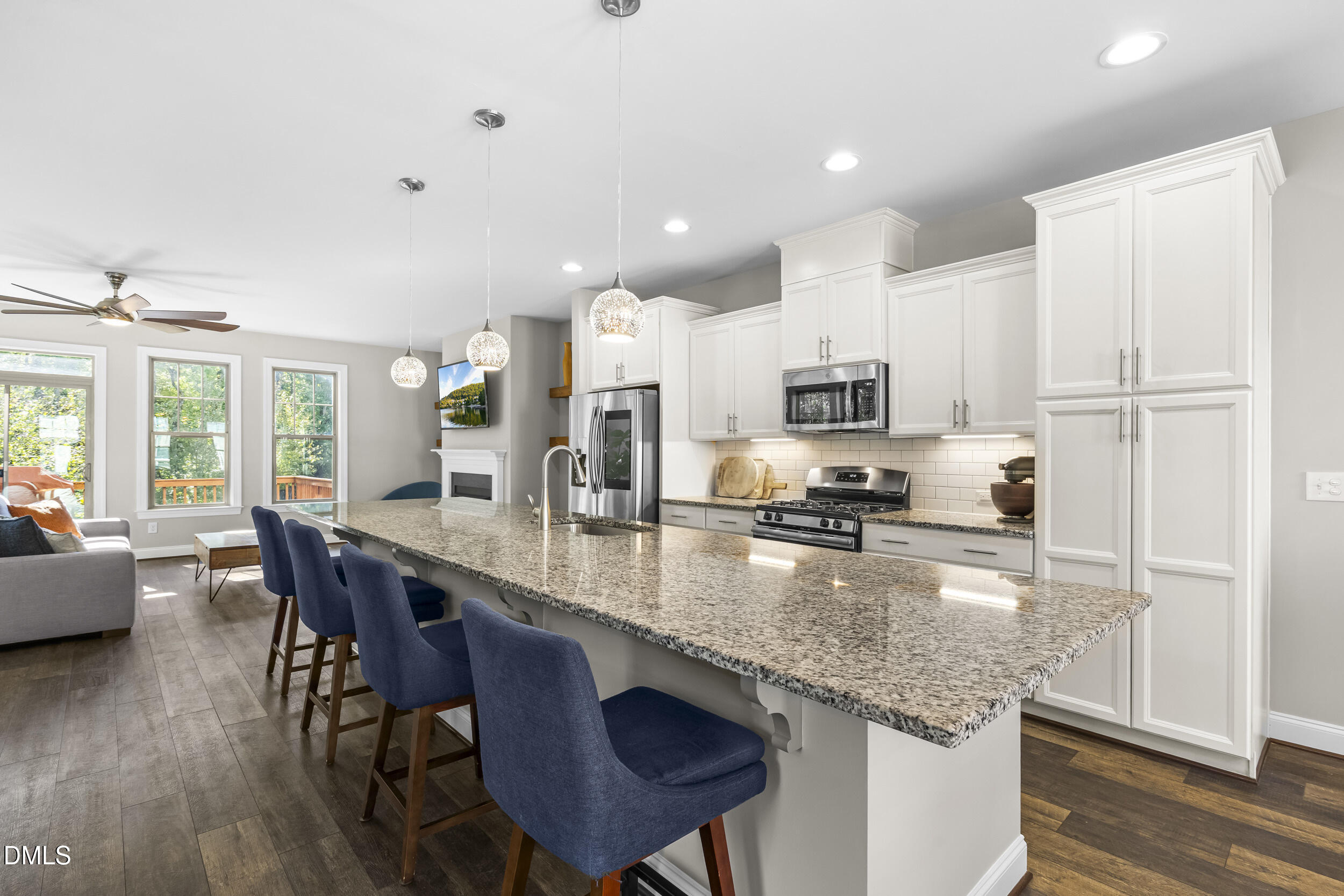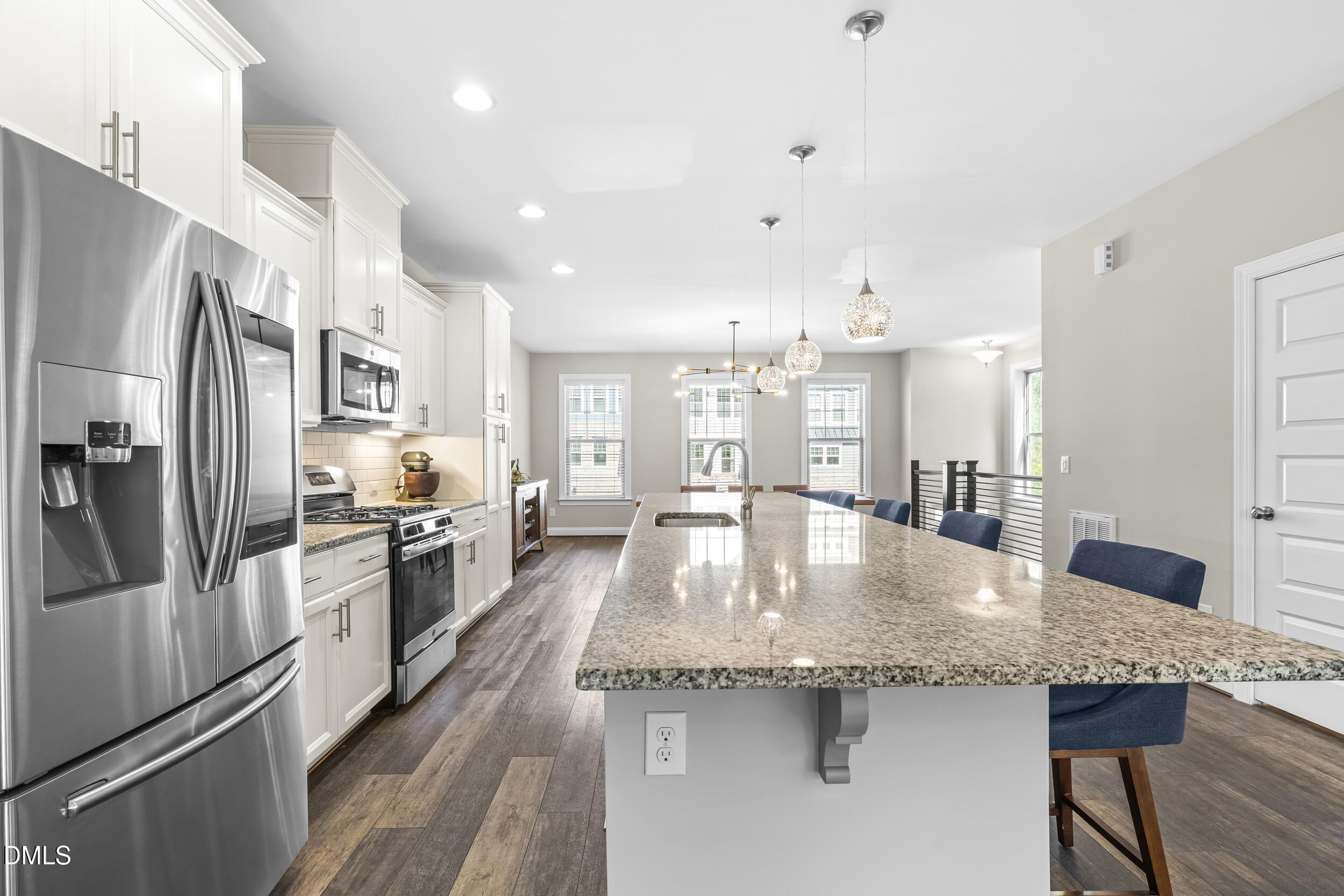 End Unit Townhome private corner homesite! Better than new! Immaculately Maintained Open Concept Living. Freshly Painted! Chef's Kitchen with a Huge Granite Island and Granite Countertops, 5 Burner Gas Range, and Stainless Steel appliances. Front Dining Room, Powder Room, and spacious Family Room with adjacent Deck. The top floor features an Owner's Suite and two secondary Bedrooms- each with walk-in closets. Large Bonus Room and full bath on the lowest level. Freshly stained Deck and Fenced Backyard. Community Pool and convenient location in the Peak of Good Living!